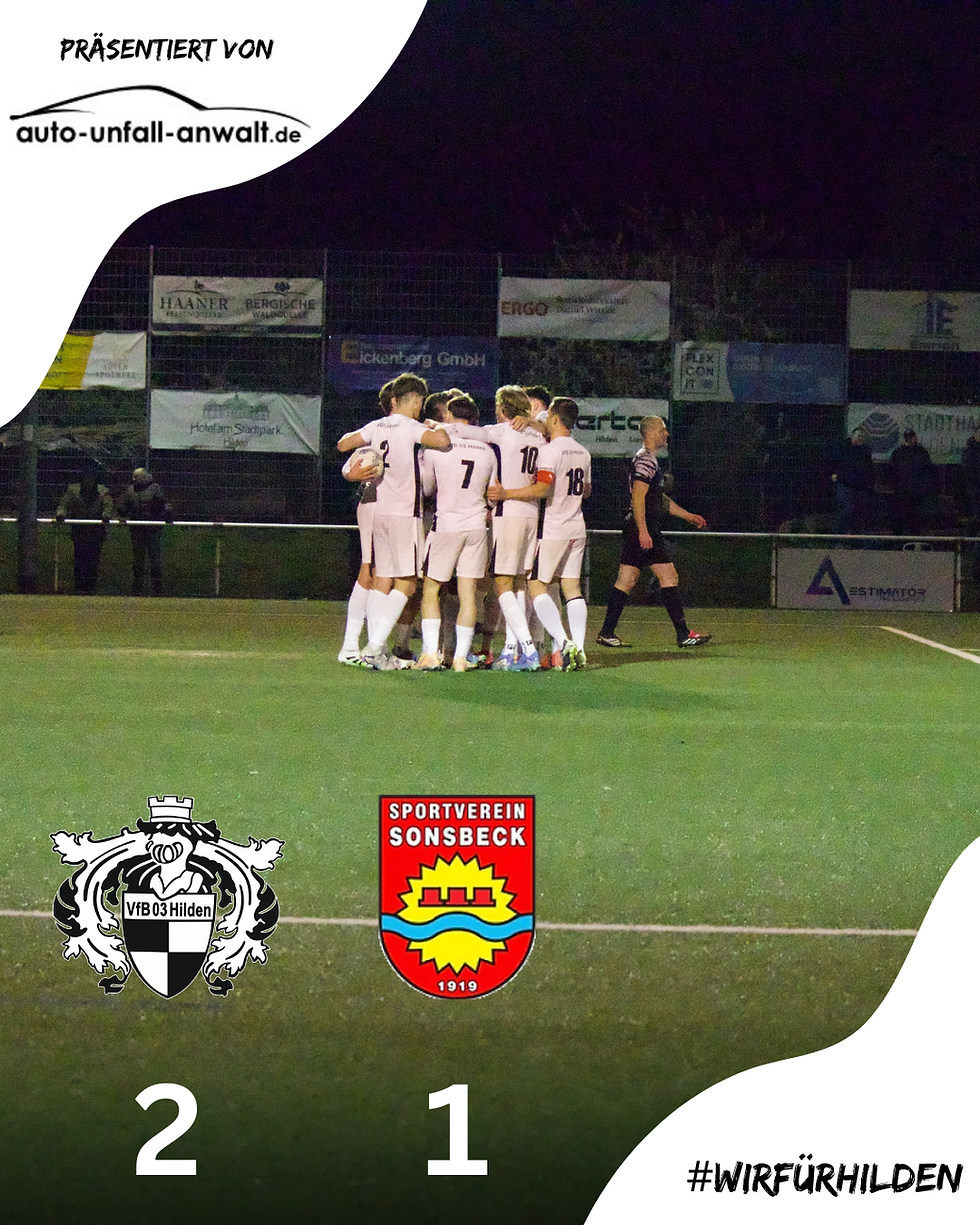 Der VfB 03 Hilden bleibt weiter das formstärkste Team der Oberliga Niederrhein und feiert mit dem 2:1-Heimsieg gegen den SV Sonsbeck den achten Erfolg im achten Rückrundenspiel. In einer intensiven und phasenweise schwierigen Partie behaupteten die Hildener ihren zweiten Tabellenplatz und bleiben punktgleich mit Spitzenreiter Ratingen 04/19.